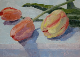 Three Tulips©2012 C.L.Burgess 6x8 oil on canvas $175